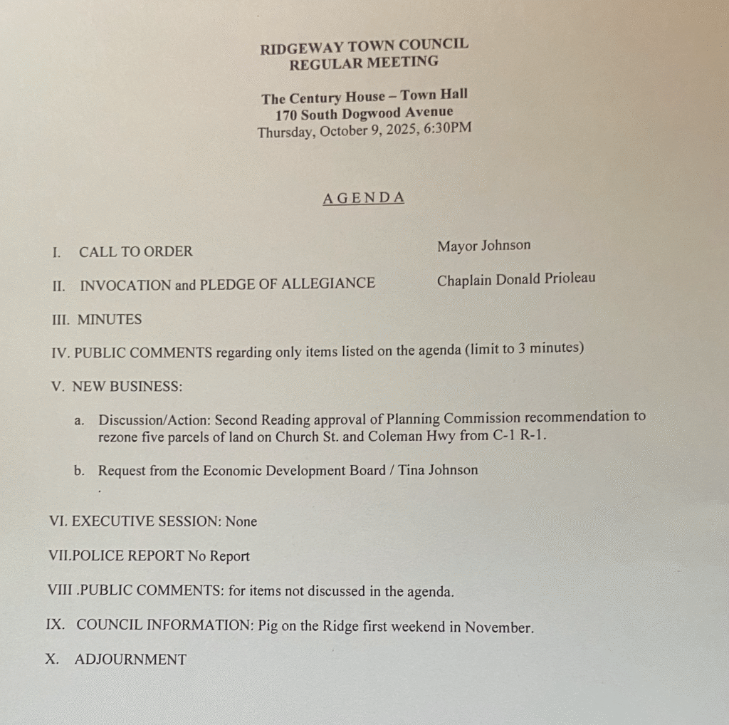 The Town of Ridgeway will hold its Regular Scheduled Meeting on Thursday, October 9, 2025, at Ridgeway Town Hall.