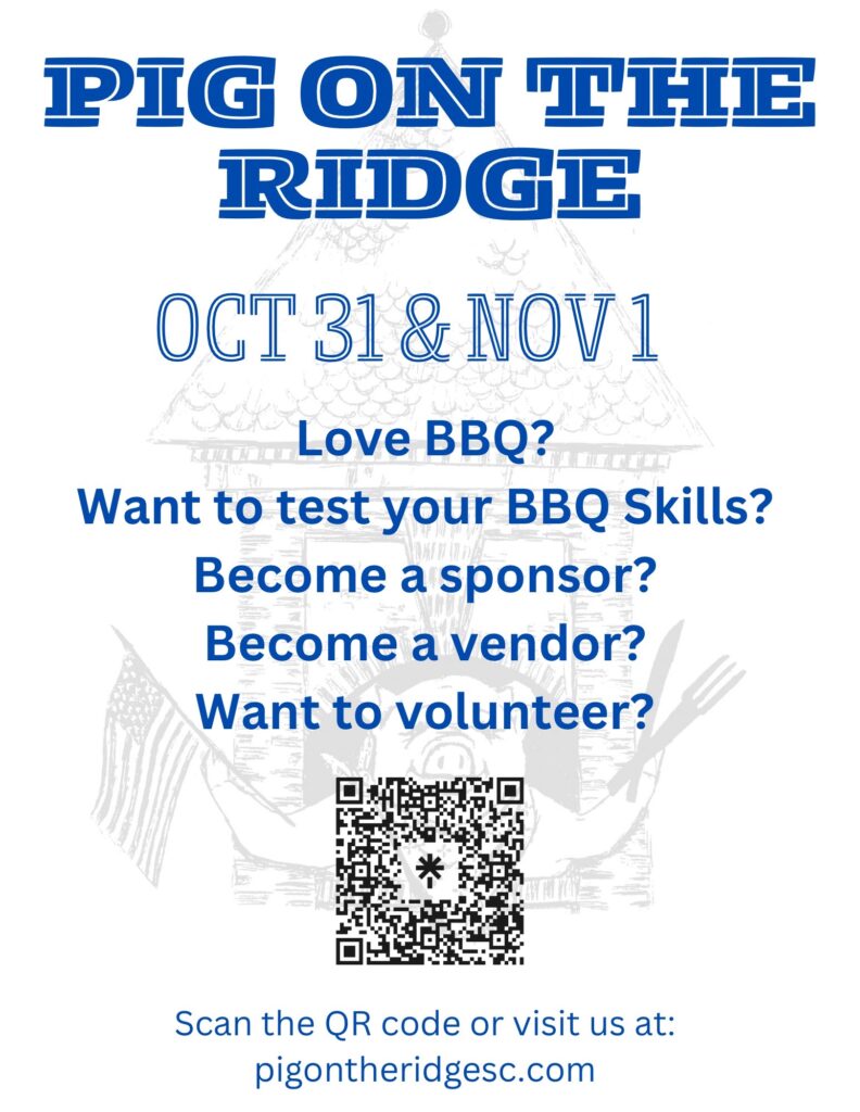 Pig on the Ridge is the largest barbecue cookout in the State and occurs the first weekend, Friday and Saturday in November in the Town of Ridgeway. It is a time when over 3000 visitors and community volunteers come together to celebrate good food and fellowship. Friday is ” No Pigs Allowed” when cook teams fix anything but barbecue to sell. A street dance is held and craft vendors offer their products.
